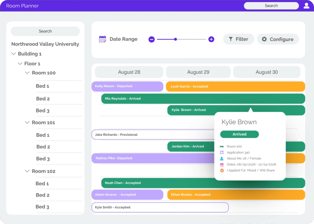 Our student housing software puts control back in your hands. Visual room planners, drag-and-drop assignments, and live reporting replace clunky spreadsheets with intuitive design.