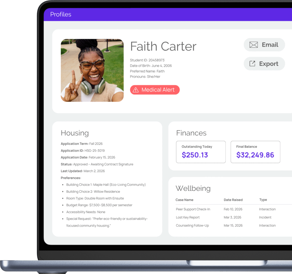 Our student housing software gives you one centralized view of every student. From applications and well-being to communication and finances, it’s all there. Clear, connected, and ready.